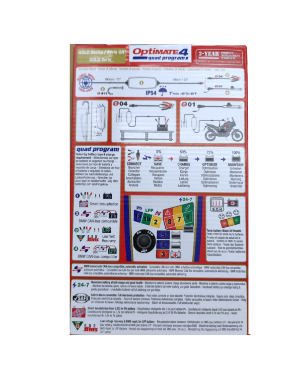 Chargeur et mainteneur de batterie automatique pour plomb 12 V/lithium 12,8 V - Programme Optimate 4 Quad